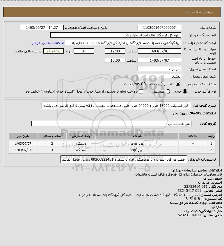 شرح کلی نیاز: کولر اسپیلت 18000 هزار و 24000 هزار، طبق مشخصات پیوست ، ارائه پیش فاکتور الزامی می باشد