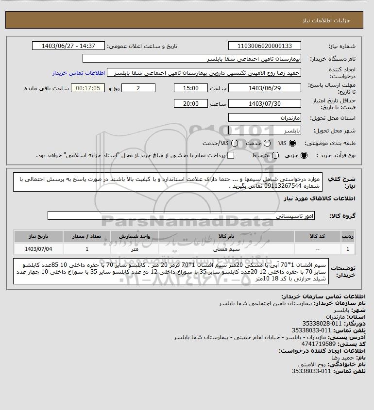 شرح کلی نیاز: موارد درخواستی شامل سیمها و ... حتما دارای علامت استاندارد و با کیفیت بالا باشند در صورت پاسخ به پرسش احتمالی با شماره 09113267544 تماس بگیرید .