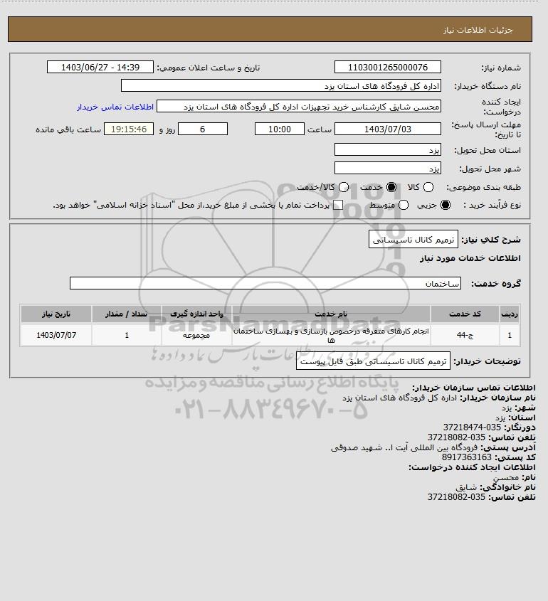 شرح کلی نیاز: ترمیم کانال تاسیساتی