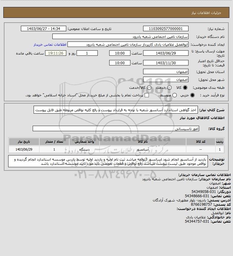 شرح کلی نیاز: اخذ گواهی استاندارد آسانسور شعبه با توجه به قرارداد پیوست و رفع کلیه نواقص مربوطه طبق فایل پیوست