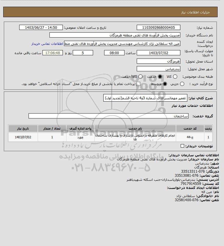 شرح کلی نیاز: تعمیر مهمانسراهای شماره 3و4 ناحیه قشم(تجدید اول)