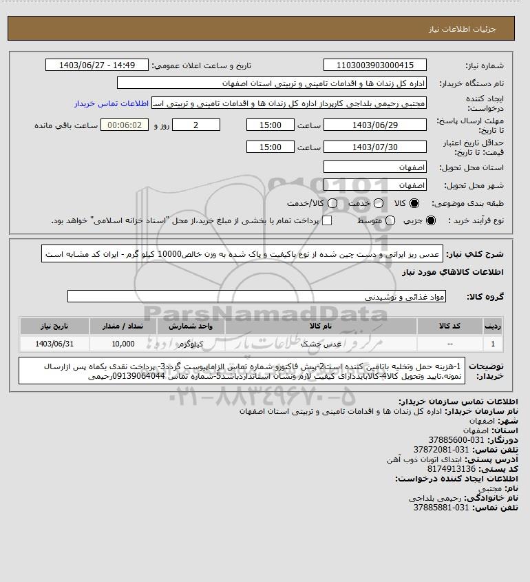 | 1 | -- | عدس خشک | کیلوگرم | 10,000 | 1403/06/31 |