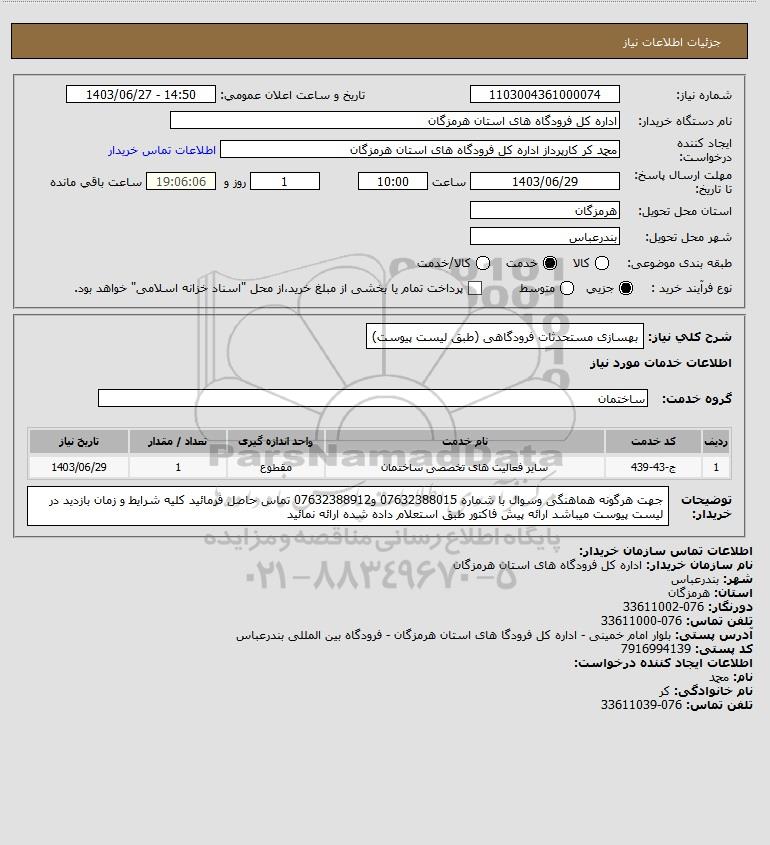 شرح کلی نیاز: بهسازی مستحدثات فرودگاهی (طبق لیست پیوست)