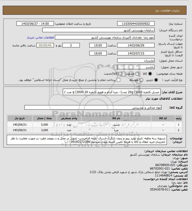 شرح کلی نیاز: عسل تکنفره 20g (5000 عدد) - مربا آلبالو و هویج تکنفره 20 g (3000 عدد )