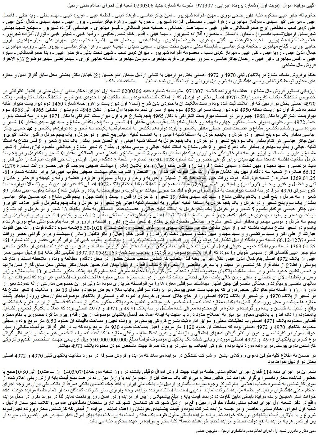 ارزیابی دستور فروش مال مشاع ؛  عطف به پرونده کلاسه  971307  مثبوت به شماره جدید 0200306 شعبه اول اجرای احکام مدنی اردبیل مبنی بر اظهار نظرثبتی در خصوص ششدانگ یکباب کاروانسرا پلاک 4970 اصلی بخش دو اردبیل که از املاک ثبت شده بوده و سند مالکیت ان با حدودی بدین شرح  ششدانگ یکباب کاروانسرا پلاک 4970 اصلی بخش دو اردبیل که از املاک ثبت شده بوده و سند مالکیت ان با حدودی بدین شرح (شمالا اول دیواریست براهرو خانه شماره 1460 دوم دیواریست بدیوار خانه نامبرده شرقا اول دیواریست بخانه 4950 دوم دیواریست بسرای 4953 سوم بدیوار سرای نامبرده جنوبا اول بدیوار دکان 4946 دوم بدیوار دکاکین 4965 الی 4968 سوم دیواریست اشتراکی با دکان 4968 چهارم در دو قسمت دیواریست اشتراکی با دکان 4965 پنجم بشارع غربا اول دیواریست اشتراکی با دکان 4971 دوم در سه قسمت بدیوار حمام 4972 سوم جنوبی بدیوار حمام مذکور چهارم به پیاده رو خیابان شاه) بنام یعقوب غیبی مقدار 44 شعیر و سه پنجم یکفلس مشاع و سید محمد سیدی بمقدار 19 شعیر و سیزده سی و ششم یکشعیر مشاع و عصمت صدر جمالی مقدار یکشعیر و یازده دوازدهم یکشعیر به انضمام ثمنیه یکپنجم سه شعیر و ده دوازدهم یکشعیر و محمد حسینی چاکر عباسی بمقدار یک سوم پنج شعیر و دو خردل و یکپنجم خردل به استثنا ثمنیه اعیانی و به انضمام ثمنیه اعیانی پنج شعیر و دو خردل و یک پنجم خردل و قدیر علاف اکبری و امین چاکر عباسی هر کدام بمقدار یک سوم پنج شعیر و دو خردل و یک پنجم خردل به استثنا ثمنیه اعیانی و ابوالحسن صدر بمقدار یک دهم 6 شعیر و 9 فلس مشاع به استثنا ثمنیه اعیانی و یعقوب مهاجری بمقدار یک دهم 6 شعیر و 9 فلس مشاع به استثنا ثمنیه اعیانی و موسی مهاجری بمقداز 6 شعیر مشاع و عبدالعلی مقصود نیازی بمقدار 4 شعیر مشاع و داور و  افسانه و ارزو هر سه بنام خانوادگی حاج نوری هرکدام بمقدار یک سوم 2 شعیر مشاع و نادعلی صدر الممالکی بمقدار 9 شعیر و یکخردل و دو پنجم سه خردل مالکیت داشته اند بعدا سید محمد سیدی برابر گواهی حصر وراثت شماره 1028-56.30 صادره از شعبه 3 دادگاه اردبیل  فوت وراث حین الفوت عبارتند از علی اکبر و سید مرتضی و سید مجید و میهن دخت و سیمین دخت ( فرزندان) و اقدس خانم (عیال) و بانو تکذبان (مادر ) میباشند همچنین بموجب گواهی حصر وراثت شماره 1276-66.12 صادره از شعبه سه دادگاه اردبیل بانو تکذبان فوت وراث حین الفوت عبارتند از پور اندخت و اشرف خانم میباشند همچنین یعقوب غیبی نیز برابر دادنامه شماره 61-1369.01.25 صادره از شعبه فوق الذکر فوت وراث حین الفوت عبارتند از شهناز و حوریه و زهرا و رویا و سیاره و عزیزه و فاطمه و رقیه و تهمینه و فرحناز و عادل و تقی و فاضل و غفور و جابر (فرزندان) و امینه پیر الماسی (عیال) میباشند همچنین ششدانگ یکباب حمام پلاک 4972 اصلی که حدود ان بدین شرح (شمالا دیواریست به کاروانسرای 4970 شرقا در سه قسمت دیواریست به کاروانسرای مرقوم فاقد حد جنوبی میباشد غربا درب و دیواریست به پیاده رو خیابان شاه ) میباشد یعقوب غیبی بمقدار 39 شعیر و سه خردل و پنج فلس و یکدهم یکفلس مشاع و سید محمد سیدی بمقدار 19 شعیر و 4 خردل 9 فلس و بیست و هفت چهل و پنجم فلس مشاع و محمد حسین چاکر عباسی بمقدار یک سوم پنج شعیر و دو خردل و یک پنجم خردل به استثنا  ثمنیه اعیانی و به انضمام ثمنیه اعیانی پنج شعیر و دو خردل و یک پنجم یکخردل و قدیر علاف اکبری و امین چاکر عباسی هرکدام یکسوم 5 شعیر و دو خردل و یک پنجم خردل به استثنا ثمنیه اعیانی و عصمت صدر الممالکی به مقدار یکهفتم 13 شعیر و دو خردل و نیم مشاع و ابوالحسن صدر و یعقوب مهاجری هر کدام یکدهم چهار شعیر مشاع به استثنا ثمنیه اعیانی و نادعلی صدرالممالکی بمقدار 12 شعیر و یکپنجم 4 شعیر و دو و نیم خردل و دو پنجم سه خردل و موسی مهاجری بمقدار شش شعیر مشاع و عبدالعلی مقصود نیازی بمقدار 4 شعیر مشاع و داور و افسانه و ارزو و هر سه بنام خانوادگی حاج نوری هرکدام یکسوم دو شعیر مشاع مالکیت داشته اند و از میان مالکین مشاعی سید محمد سیدی برابر گاهی حصر وراثت شماره 1028-56.30شعبه سوم