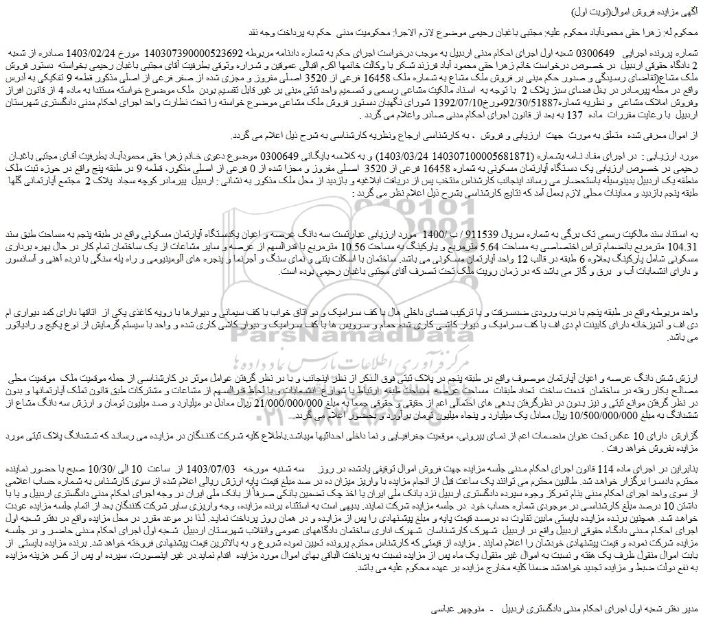 شماره پرونده اجرایی 0300649 شعبه اول اجرای احکام مدنی اردبیل به موجب درخواست اجرای حکم به شماره دادنامه مربوطه 140307390000523692 مورخ 1403/02/24 صادره از شعبه 2 دادگاه حقوقی اردبیل در خصوص درخواست خانم زهرا حقی محمود آباد فرزند شکر با وکالت خانمها اکرم اقبالی عموقین و شراره وثوقی بطرفیت آقای مجتبی باغبان رحیمی بخواسته دستور فروش ملک مشاع(تقاضای رسیدگی و صدور حکم مبنی بر فروش ملک مشاع به شماره ملک 16458 فرعی از 3520 اصلی مفروز و مجزی شده از صفر فرعی از اصلی مذکور قطعه 9 تفکیکی به آدرس واقع در محله پیرمادر در بغل فضای سبز پلاک 2 با توجه به اسناد مالکیت مشاعی رسمی و تصمیم واحد ثبتی مبنی بر غیر قابل تقسیم بودن ملک موضوع خواسته مستندا به ماده 4 از قانون افراز وفروش املاک مشاعی و نظریه شماره92/30/51887مورخ1392/07/10 شورای نگهبان دستور فروش ملک مشاعی موضوع خواسته را تحت نظارت واحد اجرای احکام مدنی دادگستری شهرستان اردبیل با رعایت مقررات ماده 137 به بعد از قانون اجرای احکام مدنی صادر واعلام می گردد .