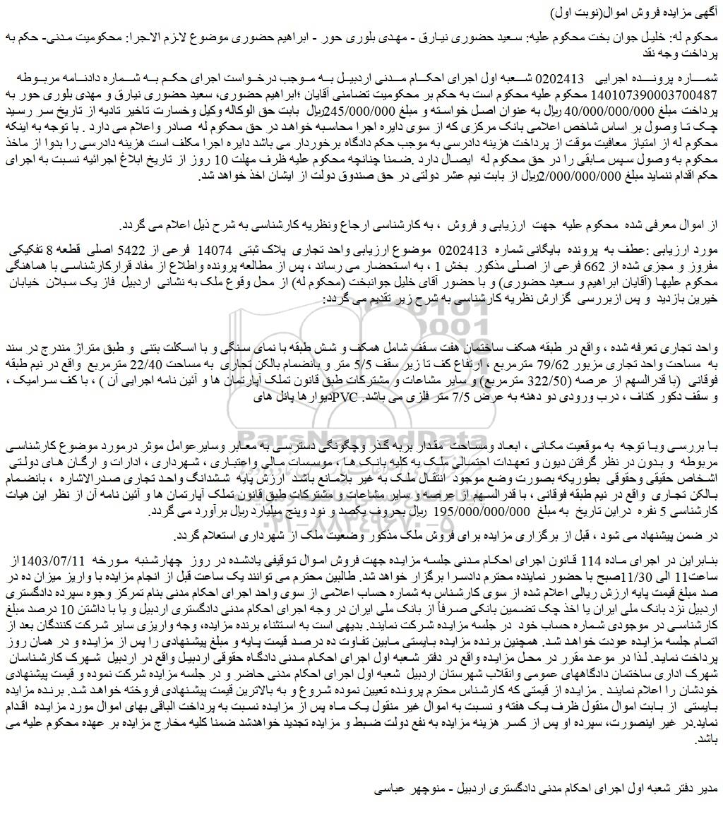 شماره پرونده اجرایی   0202413 شعبه اول اجرای احکام مدنی اردبیل به موجب درخواست اجرای حکم به شماره دادنامه مربوطه  140107390003700487 محکوم علیه محکوم است به حکم بر محکومیت تضامنی آقایان ؛ابراهیم حضوری، سعید حضوری نیارق و مهدی بلوری حور به پرداخت مبلغ 40/000/000/000 ریال به عنوان اصل خواسته و مبلغ 245/000/000ریال  بابت حق الوکاله وکیل وخسارت تاخیر تادیه از تاریخ سر رسید چک تا وصول بر اساس شاخص اعلامی بانک مرکزی که از سوی دایره اجرا محاسبه خواهد در حق محکوم له  صادر واعلام می دارد . با توجه به اینکه محکوم له از امتیاز معافیت موقت از پرداخت هزینه دادرسی به موجب حکم دادگاه برخوردار می باشد دایره اجرا مکلف است هزینه دادرسی را بدوا از ماخذ محکوم به وصول سپس مابقی را در حق محکوم له  ایصال دارد .ضمنا چنانچه محکوم علیه ظرف مهلت 10 روز از تاریخ ابلاغ اجرائیه نسبت به اجرای حکم اقدام ننماید مبلغ 2/000/000/000ریال از بابت نیم عشر دولتی در حق صندوق دولت از ایشان اخذ خواهد شد.
