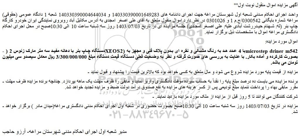 واحد اجرای احکام مدنی شعبه اول شهرستان مراغه جهت اجرای دادنامه های 140330390001649283 و 140330390004644034 شعبه 1 دادگاه عمومی (حقوقی) مراغه شماره بایگانی 0300542/ج.م 1 و 0301026 در نظر دارد اموال منقول متعلق به آقای علی اصغر امجدی به آدرس مکائیل آباد روبروی نمایندگی ایران خودرو کارگاه چاپ بنر (له: شهنام حیدررشت آبادی علیه: علی اصغر امجدی) جلسه مزایده ای در تاریخ 1403/07/03 روز سه شنبه ساعت 10 الی 10:30صبح در محل اجرای احکام دادگستری مراغه اموال با مشخصات ذیل برگزار نماید.