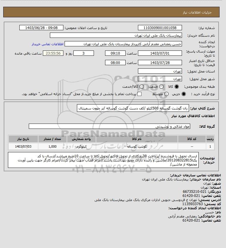 نام سازمان خریدار: بیمارستان بانک ملی ایران تهران
