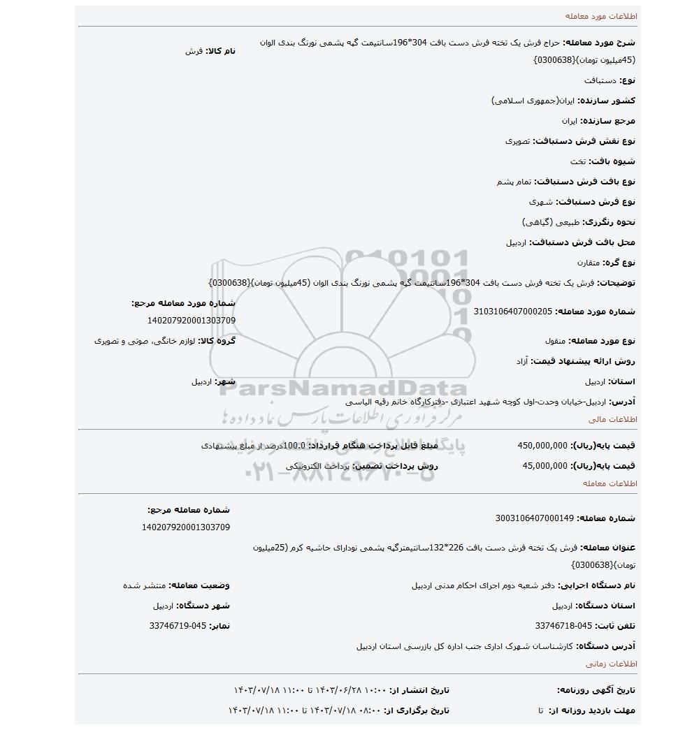 14 مزایده مزایده دو تخته فروش شش متری دستباف بمبلغ 50/000/000تومان 9619384 1404/07/07 new not special not payed آذربایجان شرقی