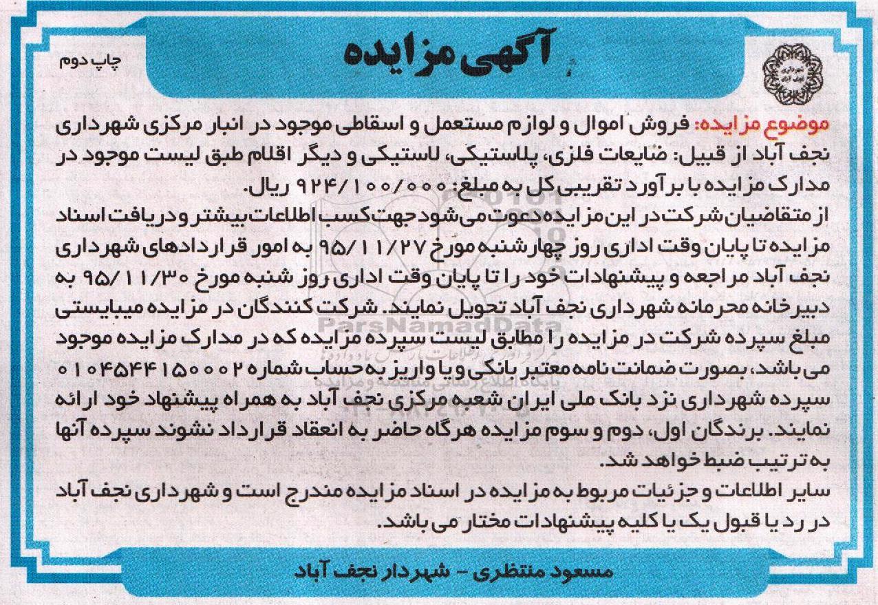 موضوع مزایده : فروش اموال و لوازم مستعمل و اسقاطی موجود در انبار مرکزی شهرداری نجف آباد از قبیل : ضایعات فلزی ، پلاستیکی ،لاستیکی و دیگر اقلام طبق لیست موجود در مدارک مزایده با برآورد تقریبی کل به مبلغ 924.100.000 ریال