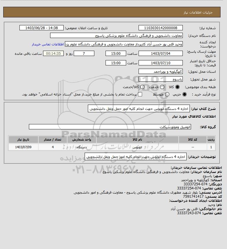 شرح کلی نیاز: اجاره 4 دستگاه اتوبوس جهت انجام کلیه امور حمل ونقل دانشجویی