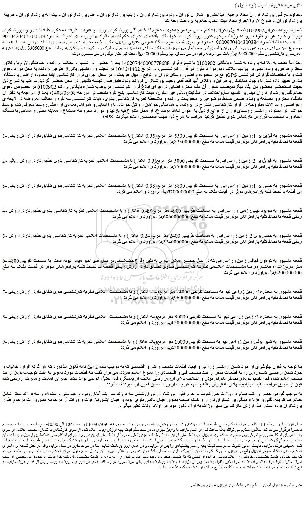 شماره پرونده اجرایی0100902شعبه اول اجرای احکام مدنی موضوع دعوی محکوم له خانم گلی پورشکران نوران و غیره به طرفیت محکوم علیه آقای ودود پورشکران نوران و غیره هر دو طرف پرونده ورّاث مرحوم غفور پورشکران به خواسته: «تقاضای اجرای حکم تقسیم ماترک» در راستای اجرائیه شماره 9010420404300219 نسبت به دادنامه شماره 9009970404300384 صادره از سوی شعبه سوم دادگاه عمومی حقوقی اردبیلمحکوم علیه محکوم است به حکم به فروش قطعات زراعی به تعداد 9 قطعه موضوع نسق زراعی مرحوم غفور پورشکر نوران و تقسیم ثمن حاصله از فروش فیمابین مالکین مشاعی به نسبت سهم از ماترک و محکومیت خواندگان به پرداخت مبلغ 3305000 ریال بابت هزینه دادرسی و کارشناسی و مبلغ 2/000/000 ریال بابت حق الوکاله وکیل در حق محکوم لهم ومبلغ 300/000 ریال بابت نیم عشر دولتی در حق صندوق دولت