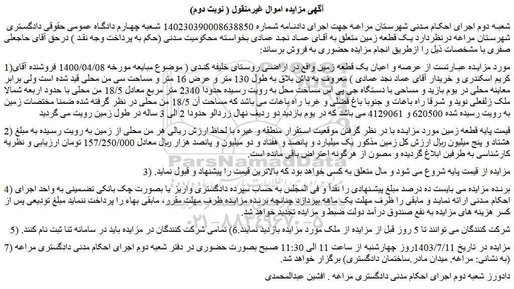 شعبه دوم اجرای احکام مدنی شهرستان مراغه جهت اجرای دادنامه شماره 140230390008638850 شعبه چهارم دادگاه عمومی حقوقی دادگستری  شهرستان مراغه درنظردارد یک قطعه زمین متعلق به آقای عماد نجد عمادی بخواسته محکومیت مدنی (حکم به پرداخت وجه نقد ) درحق آقای حاجعلی صفری با مشخصات ذیل را ازطریق انجام مزایده حضوری به فروش برساند: