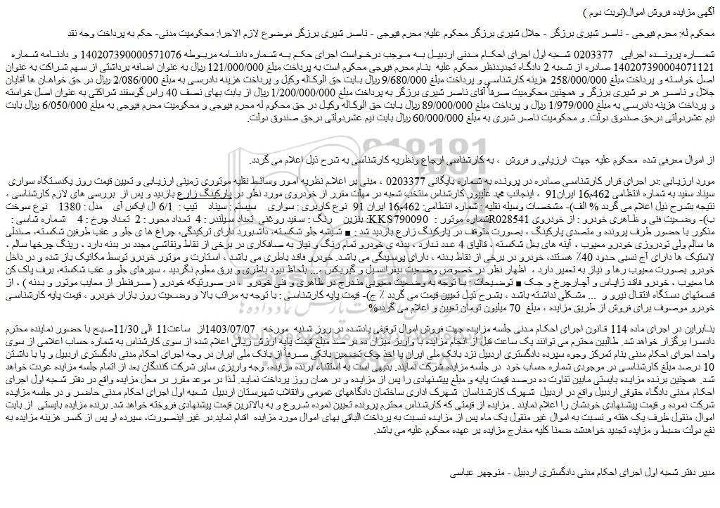شماره پرونده اجرایی 0203377 شعبه اول اجرای احکام مدنی اردبیل به موجب درخواست اجرای حکم به شماره دادنامه مربوطه 140207390000571076 و دادنامه شماره 140207390004071121 صادره از شعبه 2 دادگاه تجدیدنظر محکوم علیه بنام محرم فیوجی محکوم است به پرداخت مبلغ 121/000/000 ریال به عنوان اضافه برداشتی از سهم شراکت به عنوان اصل خواسته و پرداخت مبلغ 258/000/000 هزینه کارشناسی و پرداخت مبلغ 9/680/000 ریال بابت حق الوکاله وکیل و پرداخت هزینه دادرسی به مبلغ 2/086/000 ریال در حق خواهان ها آقایان جلال و ناصر هر دو شیری برزگر و همچنین محکومیت صرفاً آقای ناصر شیری برزگر به پرداخت مبلغ 1/200/000/000 ریال از بابت بهای نصف 40 راس گوسفند شراکتی به عنوان اصل خواسته و پرداخت هزینه دادرسی به مبلغ 1/979/000 ریال و پرداخت مبلغ 89/000/000 ریال بابت حق الوکاله وکیل در حق محکوم له محرم فیوجی و محکومیت محرم فیوجی به مبلغ 6/050/000 ریال بابت نیم عشردولتی درحق صندوق دولت. و محکومیت ناصر شیری به مبلغ 60/000/000 ریال بابت نیم عشردولتی درحق صندوق دولت.