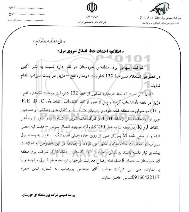 شایان ذکر است که خط دو مداره مذکور از خط 132 کیلوولت موجود تكمداره فتح دریل در نقطه A انشعاب گرفته و پس از عبور از کنار کانال آب (نقاط  A, C, D, E, F, G) در مجاورت منطقه قلعه طوق و زمینهای کشاورزی و کانالهای زهکشی و همچنین عبور از رودخانه فصلی ( نقاط H و I) و کارگاه ماسه شویی و کشاورزی و عبور از راه آهن نقاط J و K) در نقطه به خط 230 کیلوولت موجود اتصال شوش - هفت تپه متصل شده و از محل نقطه پس از عبور از روی جاده اصلی اندیمشک - اهواز به پست برق سبز آب در مجاورت جاده مذکور منتهی می گردد و چنانچه در این خصوص به اطلاعات بیشتری نیاز داشته باشند به نشانی اهواز - بلوار گلستان - فلکه کارگر شرکت برق منطقه ای خوزستان ساختمان 8 طبقه امام رضاع معاونت طرحهای توسعه خطوط برق مراجعه و یا با نماینده فنی این شرکت جناب آقای مهندس پور طالب به شماره تلفن همراه 09166422117 تماس حاصل نمایند.