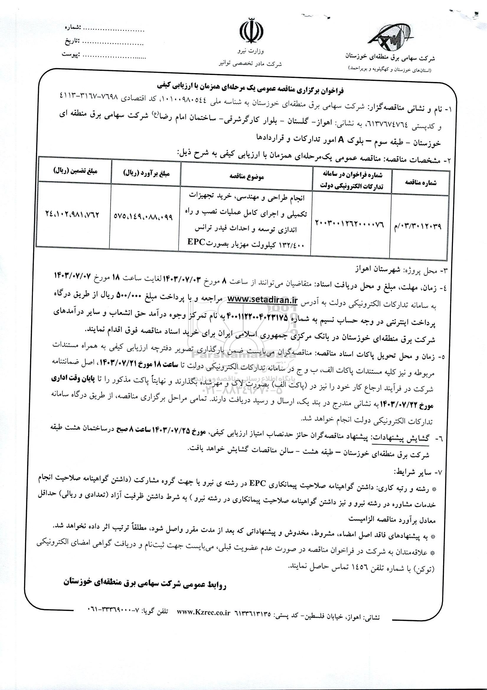 3012039/ 03 / م  2003001262000076  انجام طراحی ،مهندسی و خرید تجهیزات تکمیلی و اجرای کامل عملیات نصب و راه اندازی توسعه و احداث فیدر ترانس 132.400 کیلوولت مهزیار به صورت EPC 575.149.088.099 24.102.981.762