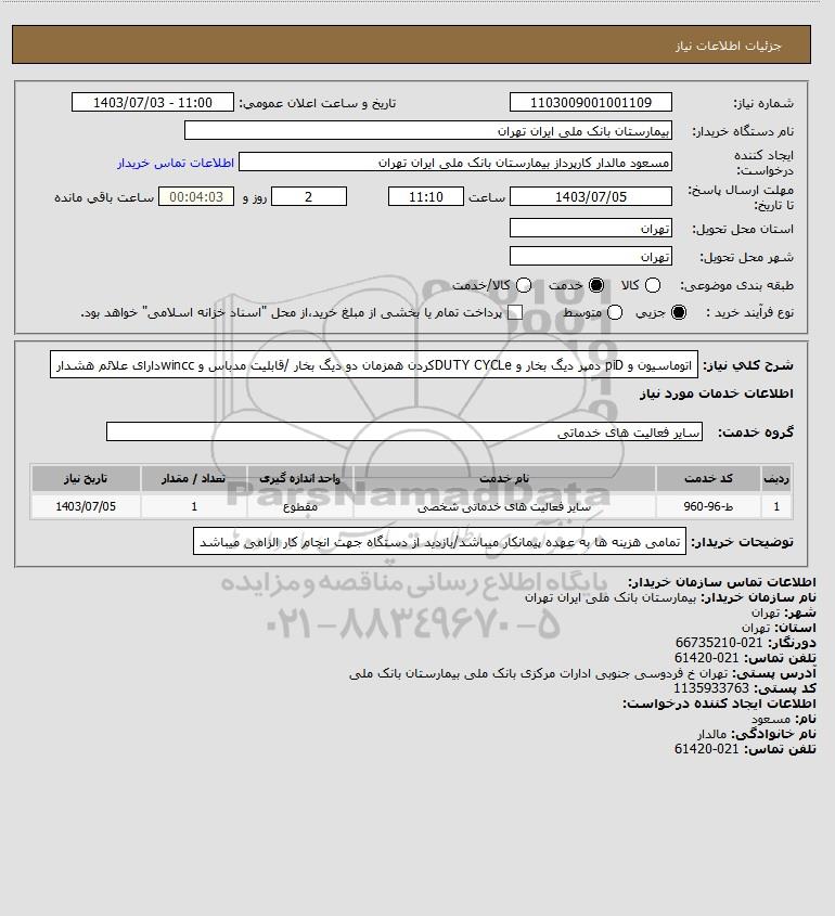 توضیحات خریدار:تمامی هزینه ها به عهده پیمانکار میباشد/بازدید از دستگاه جهت انجام کار الزامی میباشد