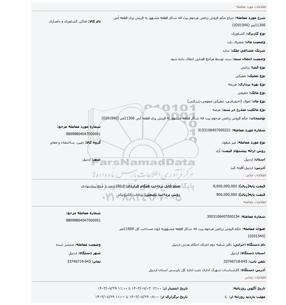 عنوان معامله: حکم فروش زراعی مرحوم بیت اله شاکر قطعه مشهوربه ازون مساحت کل 11600متر (0201540) | ||