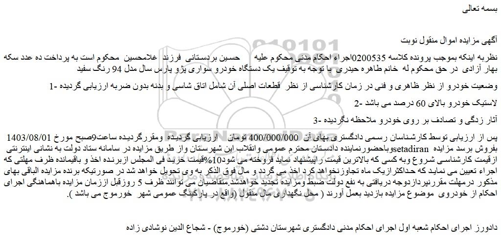 نظربه اینکه بموجب پرونده کلاسه 0200535اجراء احکام مدنی محکوم علیه حسین بردستانی فرزند غلامحسین محکوم است به پرداخت ده عدد سکه بهار آزادی در حق محکوم له خانم طاهره حیدری با توجه به توقیف یک دستگاه خودرو سواری پژو پارس سال مدل 94 رنگ سفید
