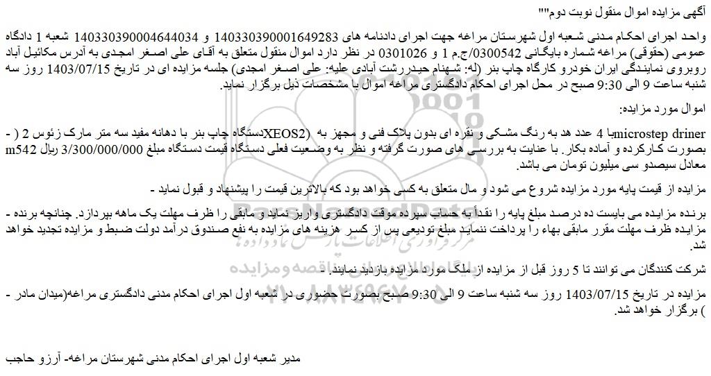 واحد اجرای احکام مدنی شعبه اول شهرستان مراغه جهت اجرای دادنامه های 140330390001649283 و 140330390004644034 شعبه 1 دادگاه عمومی (حقوقی) مراغه شماره بایگانی 0300542/ج.م 1 و 0301026 در نظر دارد اموال منقول متعلق به آقای علی اصغر امجدی به آدرس مکائیل آباد روبروی نمایندگی ایران خودرو کارگاه چاپ بنر (له: شهنام حیدررشت آبادی علیه: علی اصغر امجدی) جلسه مزایده ای در تاریخ 1403/07/15 روز سه شنبه ساعت 9 الی 9:30 صبح در محل اجرای احکام دادگستری مراغه اموال با مشخصات ذیل برگزار نماید.