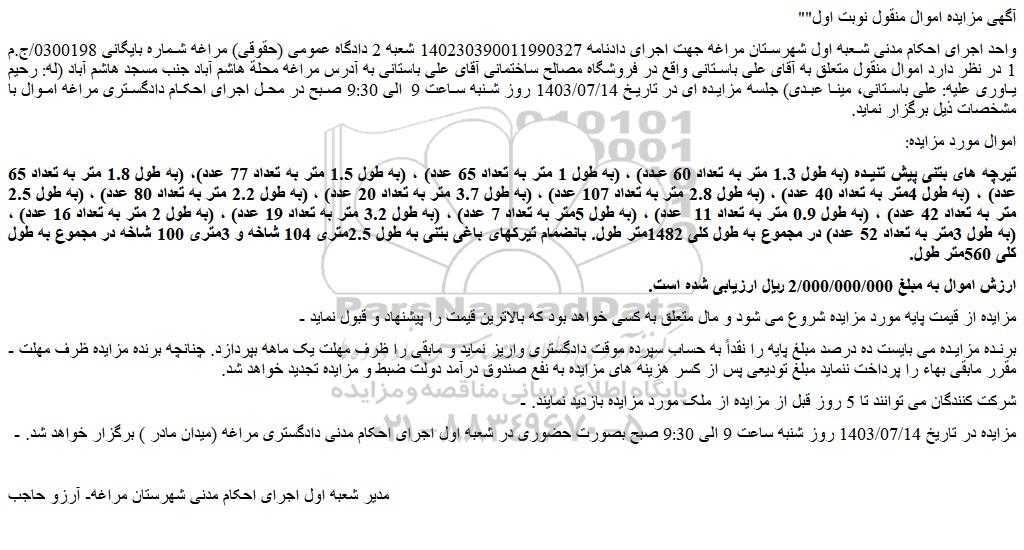 - مزایده در تاریخ 1403/07/14 روز شنبه ساعت 9 الی 9:30 صبح بصورت حضوری در شعبه اول اجرای احکام مدنی دادگستری مراغه (میدان مادر ) برگزار خواهد شد.