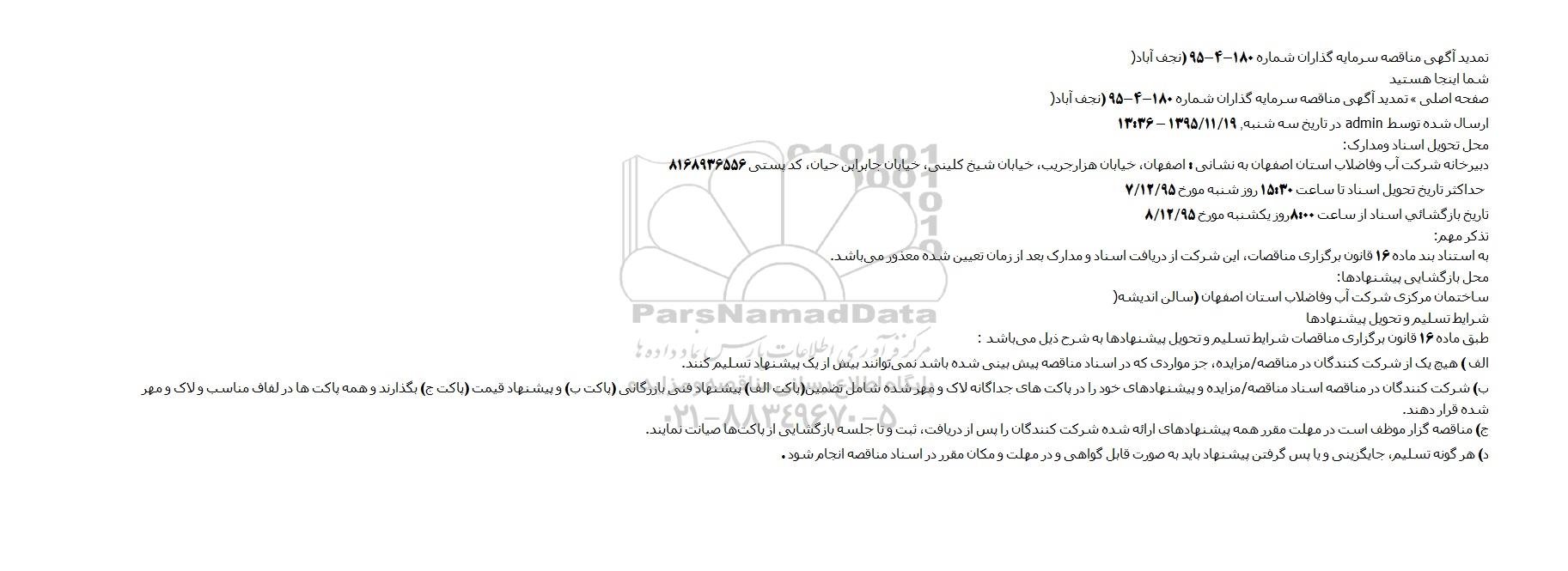تمدید آگهی مناقصه سرمایه گذاران شماره 180-4-95 (نجف آباد)