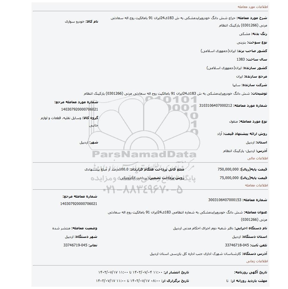 عنوان معامله: شش دانگ خودروپرایدمشکی به شماره انتظامی 183ی24ایران 91 بامالکیت روح اله سعادتی مرنی (0301266) | ||