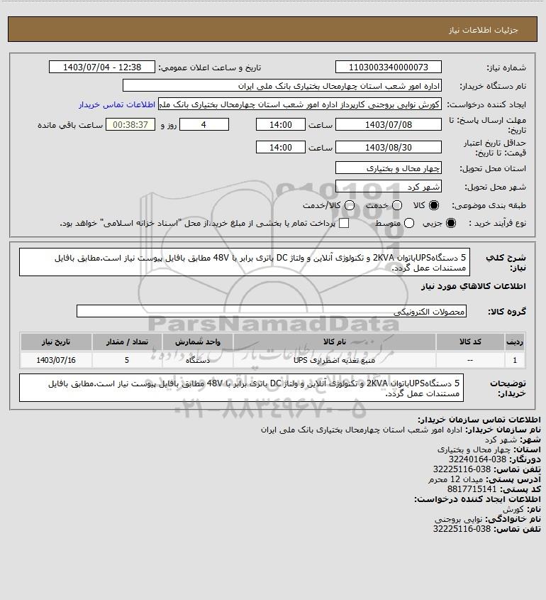 شرح کلی نیاز: 5 دستگاهUPSباتوان 2KVA و تکنولوژی آنلاین و ولتاژ DC باتری برابر با 48V مطابق بافایل پیوست نیاز است.مطابق بافایل مستندات عمل گردد.