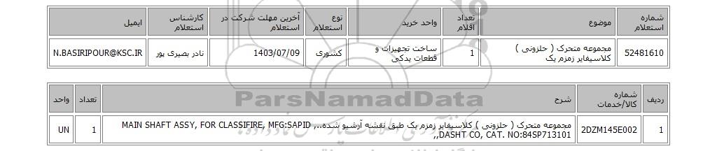 52481610مجموعه متحرک ( حلزونی ) کلاسیفایر زمزم یک1ساخت تجهیزات و قطعات یدکیکشوری1403/07/09نادر بصیری پورN.BASIRIPOUR@KSC.IR