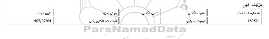 | 160521 | لیمیت سوئیچ | استعلام الکترونیکی | 1403/07/04 |