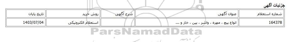 | 164378 | انواع پیچ ، مهره ، واشر ، پین ، خار و ... | استعلام الکترونیکی | 1403/07/04 |