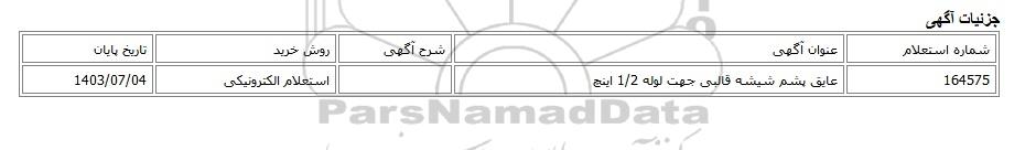 | 164575 | عایق پشم شیشه قالبی جهت لوله 1/2 اینچ | استعلام الکترونیکی | 1403/07/04 |