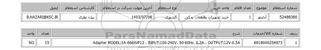| 52488380 | آداپتور | 1 | خرید تجهیزات وقطعات یدکی | کشوری | 1403/07/08 | بیژن نظری | B.NAZARI@KSC.IR |