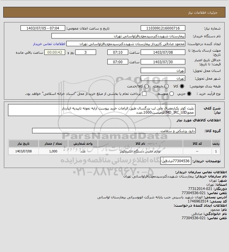 شرح کلی نیاز: پلیت کوتر یکبارمصرف ولی لب بزرگسال طبق الزامات خرید پیوست ارایه نمونه تاییدیه انباردار مجوزIMD_IRC_UIDالزمیست1000.عدد