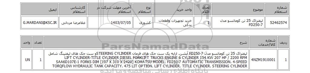 | 52462574 | لیفتراک 25 تن کوماتسو مدل FD250-7 | 1 | خرید تجهیزات وقطعات یدکی | کشوری | 1403/07/05 | غلامرضا مردانی | G.MARDANI@KSC.IR |