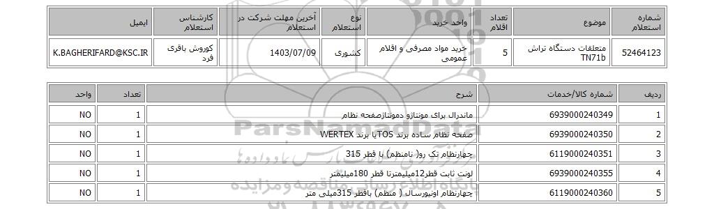 | 52464123 | متعلقات دستگاه تراش TN71b | 5 | خرید مواد مصرفی و اقلام عمومی | کشوری | 1403/07/09 | کوروش باقری فرد | K.BAGHERIFARD@KSC.IR |