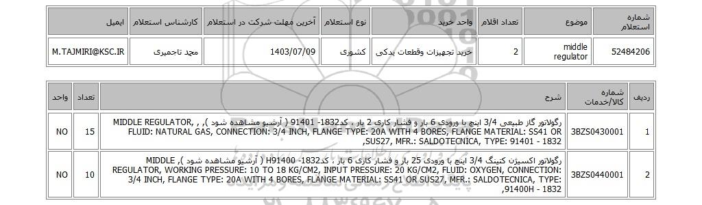 | 52484206 | middle regulator | 2 | خرید تجهیزات وقطعات یدکی | کشوری | 1403/07/09 | محمد تاجمیری | M.TAJMIRI@KSC.IR |