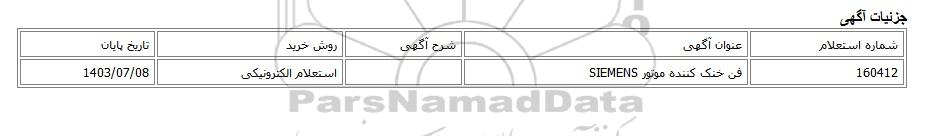 | 160412 | فن خنک کننده موتور SIEMENS | استعلام الکترونیکی | 1403/07/08 |