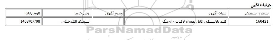 | 160421 | گلند پلاستیکی کابل بهمراه لاکنات و اورینگ | استعلام الکترونیکی | 1403/07/08 |