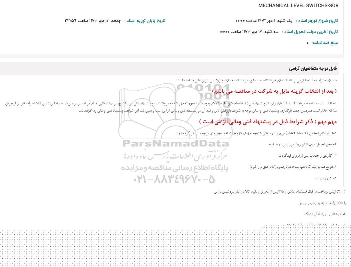 به استحضار می رساند استعلام خرید تقاضای مذکور در سامانه معاملات پتروشیمی پارس قابل مشاهده است.