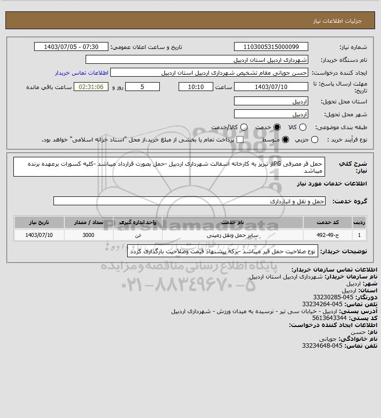 شرح کلی نیاز: حمل قر مصرفی PGاز تبریز به کارخانه اسفالت شهرداری اردبیل -حمل بصورت قرارداد میباشد -کلیه کسورات برعهده برنده میباشد