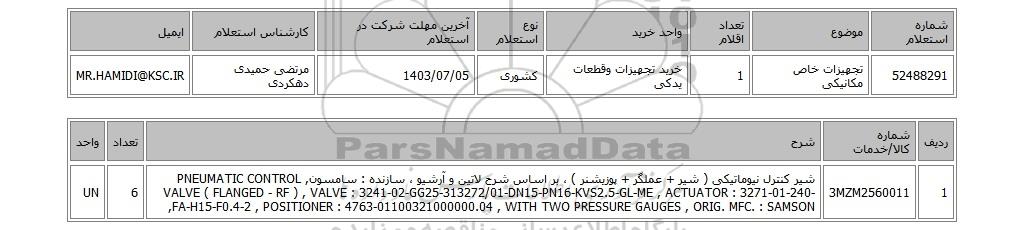 52488291تجهیزات خاص مکانیکی1خرید تجهیزات وقطعات یدکیکشوری1403/07/05مرتضی حمیدی دهکردیMR.HAMIDI@KSC.IR