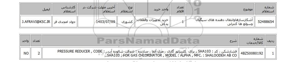 | 52488654 | آشکارسازهاوانتقال دهنده های سیگنال وسوئچ ها کنترلی | 1 | خرید تجهیزات وقطعات یدکی | کشوری | 1403/07/09 | جواد امجدی فر | J.AFRAVI@KSC.IR |
