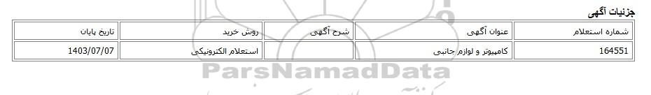| 164551 | کامپیوتر و لوازم جانبی | استعلام الکترونیکی | 1403/07/07 |