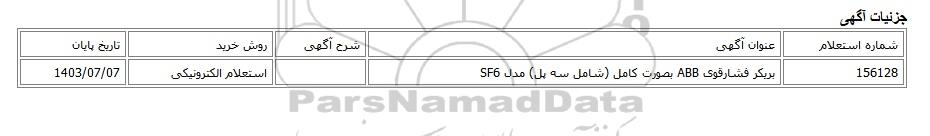 | 156128 | بریکر فشارقوی ABB بصورت کامل (شامل سه پل) مدل SF6 | استعلام الکترونیکی | 1403/07/07 |