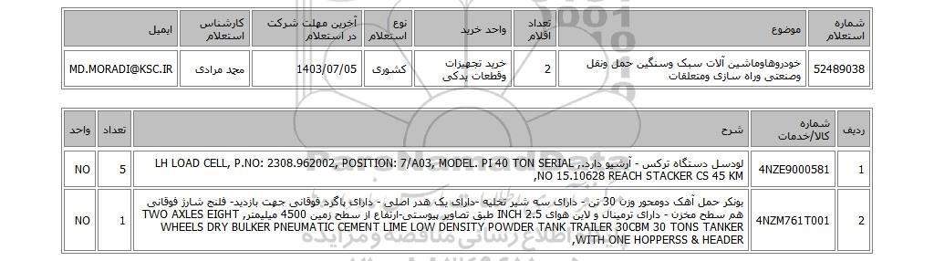 | 52489038 | خودروهاوماشین آلات سبک وسنگین حمل ونقل وصنعتی وراه سازی ومتعلقات | 2 | خرید تجهیزات وقطعات یدکی | کشوری | 1403/07/05 | محمد مرادی | MD.MORADI@KSC.IR |