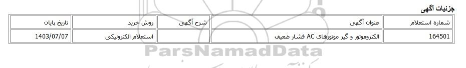 | 164501 | الکتروموتور و گیر موتورهای AC فشار ضعیف | استعلام الکترونیکی | 1403/07/07 |