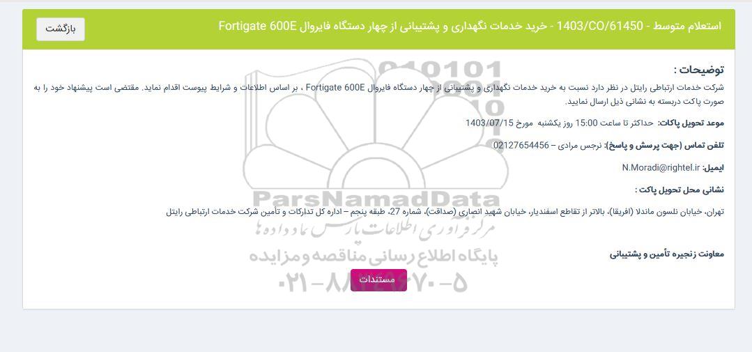 شرکت خدمات ارتباطی رایتل در نظر دارد نسبت به خرید خدمات نگهداری و پشتیبانی از چهار دستگاه فایروال Forigate 600E ، براساس اطلاعات و شرایط پیوست اقدام نماید. مقتضی است پیشنهاد خود را به صورت پاکت دربسته به نشانی ذیل ارسال نمایید