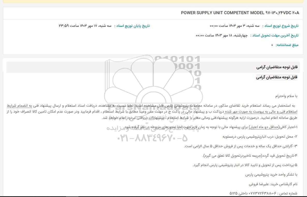 به استحضار میرساند استعلام خرید تقاضای مذکور، در سامانه معاملات پتروشیمی پارس قابل مشاهده است. لطفا نسبت به مشاهده، دریافت اسناد استعلام و ارسال پیشنهاد قنی به انضمام شرایط استعلام فنی ومالی به پیوست به صورت مهر شده در پاکت ب و پیشنهاد مالی در پاکت ج در مهلت مقرر و عینا مطابق با شرایط استعلام اقدام فرمایید و در صورت عدم امکان تامین کالا انصراف خود را از طریق سامانه اعلام نمایید. در صورت ارائه هرگونه پیشنهاد فنی و مالی مغایر با شرایط استعلام، پیشنهادات دریافتی مردود اعلام خواهد شد
